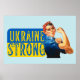 Honrando as mulheres da Ucrânia, este poster apresenta um texto "Ucrânia Forte" na bandeira ucraniana com a ilustração icônica Rosie the Riveter.