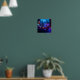 A nocturnal cyberpunk scene where blooms glow with electric blues and magentas against blurred neon city signs—a moody, atmospheric art print.