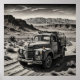 Um caminhão num deserto com montanhas desenhando trabalho de arte de carvão.