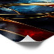 Um retrato lateral de um cavalo espantoso no estilo de abstrato. Este trabalho de arte apresenta uma técnica de vidro manchado artístico com linhas de ouro, recheadas de tons vibrantes vermelho, azul, laranja, preto e prateado sobre um fundo escuro. O resultado é um retrato majestoso de um garanhão exuberando esplendor real.