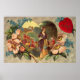 Poster de dia de Namorados com uma bela vitoriana num jardim rural de flores e rodeada por um coração.