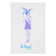 Uma pessoa vestida com uma roupa colorida de jester fica penosamente contra um fundo azul, abstrato. O chapéu de bobina tem múltiplos pontos com pequenos ornamentos nas pontas, e suas roupas apresentam uma mistura de padrões de diamante e cores sólidas