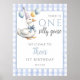 Este encantador letreiro de boas-vindas de 1º aniversário apresenta um ganso fofo e um fundo xadrez azul. Criado por Thisisnotme©