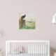 Um Pavão Azul empoleirado em uma parede de tijolos enquanto ele assiste sobre sua pavoa branca enquanto ela e seus pintinhos se alimentam da grama Este design Adorável está neste Poster x 24", O tamanho dos posters pode ser mudado para atender às suas necessidades.