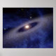 Um sistema solar distante onde planetas e asteroides circulam ao redor de dois sóis apresentando animação.