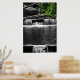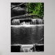 Foto em preto e branco de um pequeno rio e cascata apresenta um toque de verde nas folhas penduradas acima.