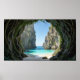 Esta imagem retrata uma enseada secreta acessível apenas por uma caverna marítima estreita coberta de vinhas. A água dentro é um turquesa brilhante impossível. Penhascos irregulares enquadram a praia imaculada em uma pintura digital detalhada com influências do Art Nouveau.