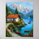 Poster Uma pequena casa ao fundo de um lago montanhoso