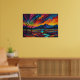 Uma pintura Abstrato de um pôr do sol com uma árvore e montanhas ao fundo