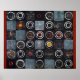 Uma pintura de abstrato; uma grade de círculos estampados sobre um fundo escuro.