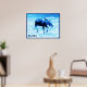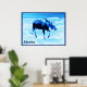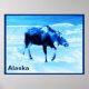 Imagem monocromática (azul) de um alce de vaca a andar na neve. A leitura de texto "Alaska" também é exibida. Moose são residentes em muitas comunidades nortes ao longo do ano. Aqui em Anchorage há cerca de 1500 animais, juntamente com lobos, ursos pardos e outros animais selvagens. Eles são geralmente bem comportados. Muitas vezes atravessam as ruas nas passagens de pedestres, depois de esperarem por um sinal de caminhada.