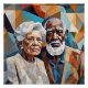 Esta peça de estilo geométrico retrata um casal idoso com amor e serenidade, usando triângulos coloridos em tons quentes e frios. As formas entrelaçadas simbolizam uma vida compartilhada, enquanto as cores vibrantes destacam a força e a harmonia da conexão deles ao longo do tempo.