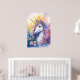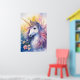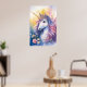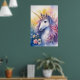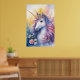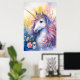 Poster de um monocórnio majestoso com uma buzina ouro cercada por flores vibrantes. Seu homem flui em tons roxos, cor-de-rosa e azuis, se misturando perfeitamente em um cenário suave e sonhador.