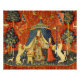 A Senhora e o unicórnio, uma tapeçaria medieval por volta de 1500, é um de um conjunto de tapeçarias francesas, consideradas obras de arte excelente da Idade Média. Esta Dama e a tapeçaria do Unicórnio é uma imagem impressionante de uma senhora em uma tenda, com um unicórnio de um lado dela, e um leão do outro. Há um pequeno cachorro branco sentado em um banco ao lado dela, e uma donzela no outro lado. O fundo da tapeçaria é um campo vermelho de flores e animais, incluindo cães, coelhos e aves. A tapeçaria original medieval do Unicórnio estava bastante danificada e perdeu muito de sua cor e qualidade brilhantes originais. Enquanto pudemos restaurar algumas das colorações originais da tapeçaria vermelha e azul da Unicórn, por favor, saibam que ainda há imperfeições na imagem. No entanto, o nosso é uma versão única desta tapeçaria medieval, à medida que a alargámos e a aperfeiçoámos para trazer à tona a sua beleza original.