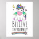Um doce unicórnio agarra este design, acentuado pela lua, coração, e estrela cadente, e um slogan inspirador que lê "Acredite em si mesmo!" Todas as crianças adoram cavalos e até sonhos de possuir um unicórnio. Este amigo mágico voador vai ajudar a aumentar a crença do seu filho no seu próprio poder. Ideal para Mães e Pais também!
