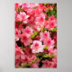 Vibrant pink flowers are densely clustered, with each blossom displaying soft, delicate petals and subtle variations in color. Green leaves peek through the blooms, adding a contrasting backdrop of lush foliage.