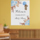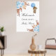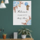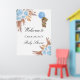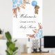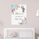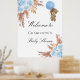 Um poster de boas-vindas para um chá de fraldas elegante e moderno. Um fundo branco, uma erva pampas de estilo "boho", florais azuis claros e um ursinho de peluche segurando um balão azul. Personalize e adicione um nome.