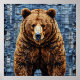Arte vibrante que retrata um urso com um rico casaco de pelo texturizado, colocado contra um fundo de retalhos com tons azuis e cinzas. O urso permanece imponente e realista, capturando a atenção com suas características realistas.
