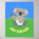 Este coala marsupial bonitinho está gostando de um lanche e acenando olá. Desenhado no estilo de ilustração de desenho animado para o quarto de uma criança.
