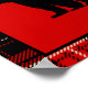 Urso negro em vermelho com uma xadrez vermelha e preta.