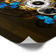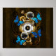 Composição do relógio de aço redondo com discagem numérica romana preta, decorado com engrenagens de ouro e latão, borboletas morfo azuis e lentes danificadas sobre fundo listrado castanho. Estilo Steampunk.