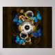 Composição do relógio de aço redondo com discagem numérica romana preta, decorado com engrenagens de ouro e latão, borboletas morfo azuis e lentes danificadas sobre fundo listrado castanho. Estilo Steampunk.