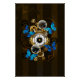 Composição do relógio de aço redondo com discagem numérica romana preta, decorado com engrenagens de ouro e latão, borboletas morfo azuis e lentes danificadas sobre fundo listrado castanho. Estilo Steampunk.
