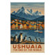 Poster de viagens vintage retrô de Ushuaia, Argentina, a cidade mais ao sul do mundo. Primeiro plano: casas coloridas ao longo da frente d'água com pequenos barcos ancorados no porto.