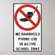 Sinal de estrada avisando que os celulares portáteis não podem ser usados em uma zona escolar.