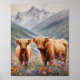 Esta poster é uma pintura de duas vacas de terras altas em uma paisagem natural. As vacas têm pelo longo e chifres, e estão cercadas por flores coloridas. O fundo mostra uma cordilheira com neve e névoa. O poster tem uma paleta de cores suave e serena. 🎨