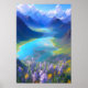 Esta obra de arte digital apresenta uma vista de morro de um vale maravilhoso com um belo lago azul, cercado por montanhas cobertas de neve à distância. Flores roxas claras em primeiro plano adicionam um toque de elegância à cena, criando uma visão mesmerizadora e cativante.