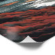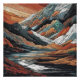 Uma paisagem montanhosa surreal com um rio sinuoso sob um céu alaranjado, apresentando rochas em tons terrosos, brancos e azulados, e uma paleta de cores rica e vibrante.