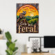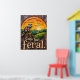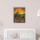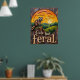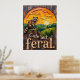 Esta pintura única apresenta um guaxinim com suas marcas distintivas, empoleirado em uma formação rochosa enquanto o crepúsculo desce sobre um vale rolante. O céu é uma mostra dramática de laranjas e amarelos do sol de pôr, lançando longas sombras através das colinas verdes. O texto "Bonito mas selvagem" é corajosamente escrito em amarelo na base do trabalho de arte, renderizado em um estilo grosso e texturizado.