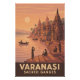Poster de viagens retrógrado de Varanasi, Índia, representando o rio Ganges sagrado no nascer do sol. Primeiro plano: ghats ao longo do rio com pequenos barcos e sutis silhuetas de pessoas atuando no pôr do sol