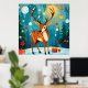 Uma ilustração encantadora de um veado adornada com uma cena festiva, cercado por decorações e árvores contra uma noite coberta de neve. As cores vibrantes do feriado criam uma atmosfera alegre e convidativa.