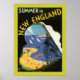 Viagens vintage de poster promovendo o verão em Nova Inglaterra, mostrando uma ilustração surrealista de arte deco de um trem a vapor e resort à beira-mar.