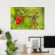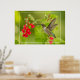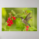 Um beija-flor doce paira antes que a salvia vermelha brilhante floresça contra um fundo verde macio.