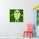 Um desenho de uma uva verde sorridente com olhos escuros brilhantes e uma boca rosa sobre fundo verde escuro.
