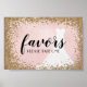 Moldura brilhante em dourado rosa (falso) salpicada por toda parte com um efeito texturizado fundo rosa corado e nosso vestido de noiva sereia exclusivamente nosso. Diz "Presentes, por favor, pegue um"
