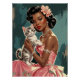 A imagem retrata uma cena glamourosa, inspirada no vintage, com uma mulher negra vestida de um elegante vestido rosa sem amargo adornada com delicado bordado floral. Ela expele sofisticação, acessada com um colar de pérolas de várias camadas, brincos de convivência, uma pulseira cintilante e um grande anel de ornamentado no dedo. Uma flor cor-de-rosa com um centro joalhado enfeita o seu cabelo volumoso e retrô, que é varrido para um intrincado topo. Em seus braços, ela levemente segura um gatinho pequeno, com uma casaco branca e cinza listrada, seus olhos largos olhando para fora. O fundo é uma parede texturizada, azul-lacrimogênea com uma aparência ligeiramente angustiada, acrescentando um toque de contraste à estética feminina e luxuosa geral da cena.