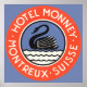 Ilustração vintage de pôster de viagem europeu ou etiqueta de bagagem do Hotel Monney, Montreux, Suíça, apresentando um design circular com um cisne nadando em um lago. Hotel Monney, Montreaux, Suíça.