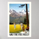 "Golf The Vail Valley". Vintage Colorado Golf Poster anunciando férias de golfe no Vail Valley Colorado. Mulher golfista balança seu clube de golfe contra um fundo de neve majestosa cobria montanhas e pinheiros, acompanhada por um companheiro masculino e um grupo de amigos que almoçam piquenique. Retro reprodução de Posteres de viagens desportivos.