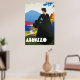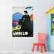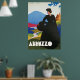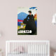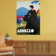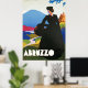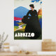 Esta poster de publicidade de safra é para uma região em Itália chamada Abruzzo. Esta é uma design mais contemporânea feita em blues, ouro vermelho e preto. Uma mulher fica no chão vestida de preto.