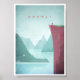Poster de viagens de estilo Vintage de um penhasco sobre os fiordes noruegueses, inspirado pela publicidade da viagem nórdica vintage do 1920. O texto diz Visite Norwar. Imagem original desenhada e digitalmente reproduzida por Henry Rivers para Poster de viagens Co.
