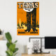 Visto da cintura para baixo, um vaqueiro em botas fica em frente a um horizonte com um avião sobrevoando. Uma poster viagens vintage do Texas.