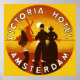 Ilustração Vintage: etiqueta europeia de poster de viagens ou bagagem do Hotel Victoria, Amesterdã, Holanda (Países Baixos), com um homem e uma mulher vestidos tradicionais e entupidos de visto. Um moinho de vento, um veleiro no oceano e um pôr do sol amarelo estão no fundo atrás de uma silhueta de um casal feliz.
