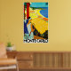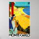 Este poster de propaganda vintage é para Monte-Carlo. Mostra um homem e uma mulher em roupas de tênis olhando para a praia. As cores são azuis vibrantes, laranjas e verdes.