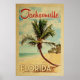 Um impressão de arte moderno do século médio, Jacksonville Florida, no estilo viagens vintage. Ele apresenta uma palmeira curva na praia arenosa com oceano sob um céu azul nublado.