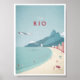 Poster de viagens do estilo Vintage da icônica praia de Ipanema, no Rio, Brasil. O texto diz Visitar Rio. Posters de viagens vintage desenhadas à mão e reproduzidas digitalmente desenhadas pela VintageTravelPosters.co.