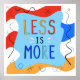 This image features the phrase "LESS IS MORE" in bold, colorful, outlined letters: "LESS" in orange, "IS" in black, and "MORE" in blue. The text is situated on a light blue, irregularly shaped background. Surrounding this central element are various abstract and playful shapes in red, orange, and darker blue, along with thin black wavy lines and asterisk-like marks, all against a white background. The overall design is dynamic and modern, embodying the "less is more" concept through its clean lines and distinct color blocks, while still maintaining visual interest.